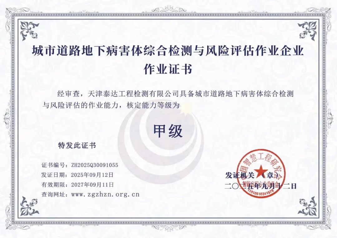 近日,泰达市政所属泰达检测公司成功取得“城市道路地下病害体综合检测与风险评估作业企业甲级”证书。这一资质的获得,标志着公司在城市道路地下安全检测领域的专业技术实力与服务能力再上新台阶,持续位居行业领先水平。