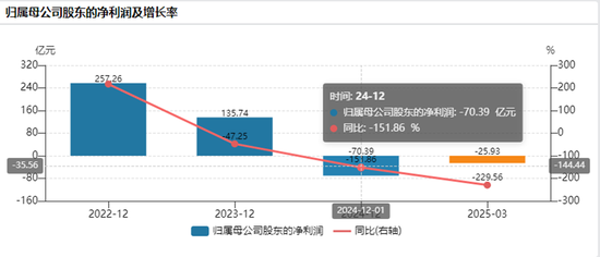 2025 年一季报延续颓势:一季度营收 159.33 亿元,同比减少 18.58%;净亏损 25.93 亿元,业绩同比下滑229.56%,业绩颓势未现拐点。